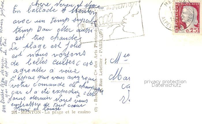 13534839 carte postale Menton Alpes Maritimes La Plage et le Casino postalisch gelaufen Erhaltung siehe scans [WerneD78] KatCode: 11170006206083
