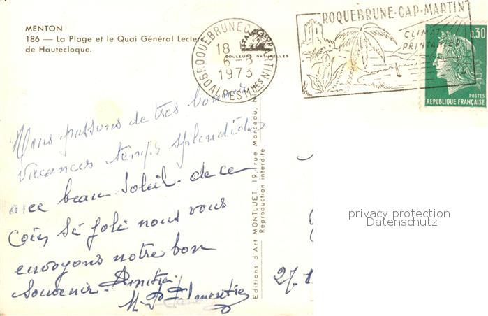 13534838 carte postale Menton Alpes Maritimes La Plage et le Quai General Leclerc de Hautecloque postalisch gelaufen Erhaltung siehe scans [WerneD78] KatCode: 11170006206083