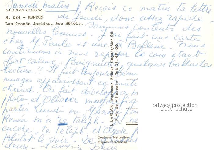 13545826 Menton Alpes Maritimes Les Grands Jardins Les Hotels postalisch nicht gelaufen Erhaltung siehe scans [WerneD78] KatCode: 11170006206083