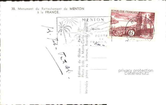 12306784 carte postale Menton Alpes Maritimes Monument Rattachement postalisch gelaufen Erhaltung siehe scans KatCode: 11170006206083