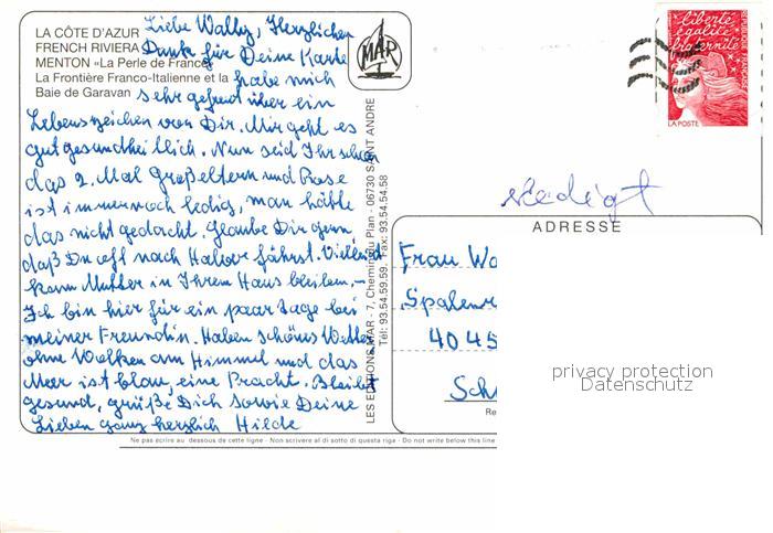 12705359 carte postale Menton Alpes Maritimes Panorama Cote d Azur Frontiere Franco Italienne e la Baie de Garavan postalisch gelaufen Erhaltung siehe scans [FriedD77] KatCode: 11170006206083