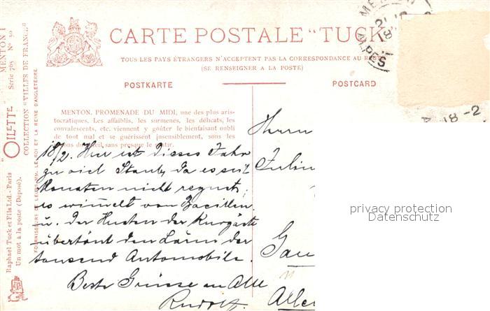 13366111 carte postale Menton Alpes Maritimes Promenade du Midi Cote d Azur Oilette Serie 765 No. 50 Kuenstlerkarte postalisch gelaufen Erhaltung siehe scans [FriedD77] KatCode: 11170006206083