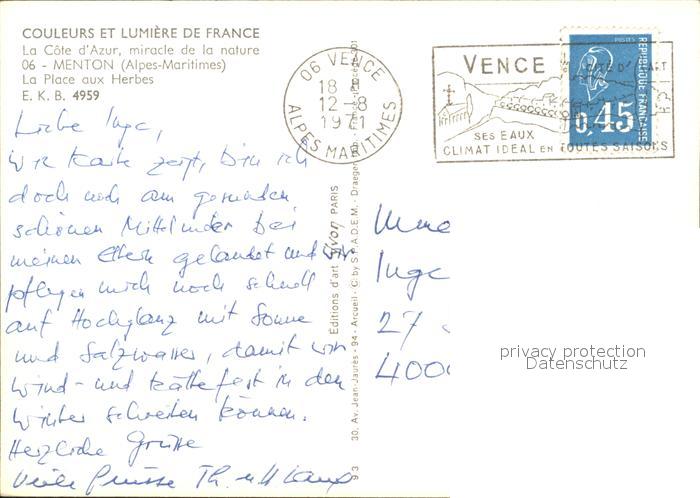 12349559 carte postale Menton Alpes Maritimes Teilansicht postalisch gelaufen Erhaltung siehe scans KatCode: 11170006206083