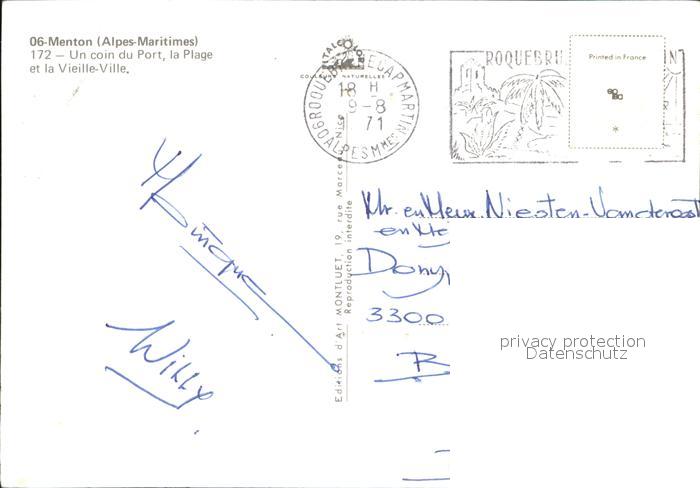 12505309 carte postale Menton Alpes Maritimes Teilansicht mit kleinem Hafen postalisch gelaufen Erhaltung siehe scans KatCode: 11170006206083