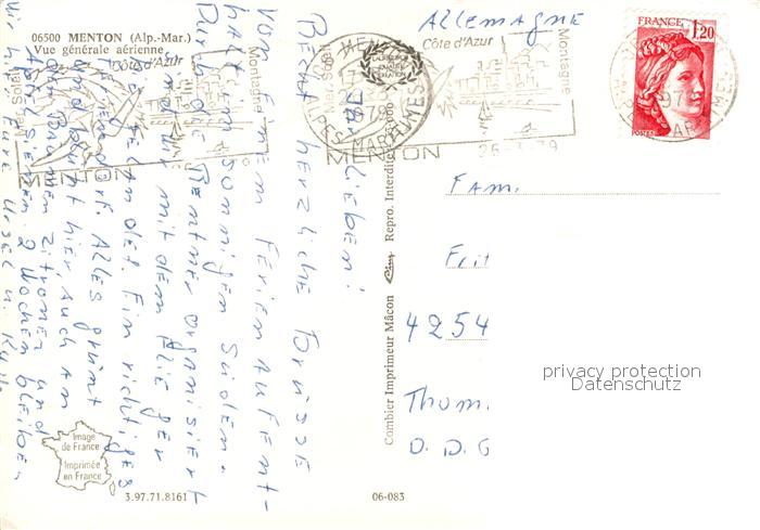 13235255 carte postale Menton Alpes Maritimes Vue aérienne postalisch gelaufen Erhaltung siehe scans [FriedD77] KatCode: 11170006206083