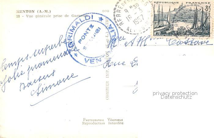 13534639 carte postale Menton Alpes Maritimes Vue Generale prise de Garavan postalisch gelaufen Erhaltung siehe scans [FriedD77] KatCode: 11170006206083