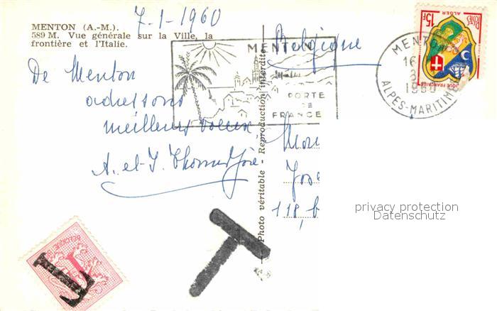 12875152 carte postale Menton Alpes Maritimes Vue generale sur la Ville la frontiere et l’Italie postalisch gelaufen Erhaltung siehe scans [FriedD77] KatCode: 11170006206083