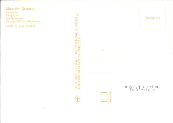 72550322 Menz Gransee Schulplatz Bungalows Roofensee Zeltplatz postalisch nicht gelaufen Erhaltung siehe scans [KathaD79] KatCode: 11110012065310