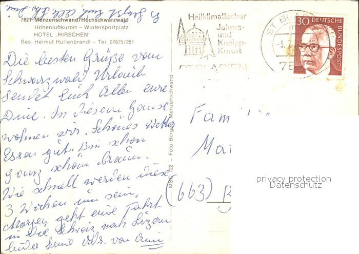 72314326 alte Postkarte Menzenschwand Hotel Hirschen postalisch gelaufen Erhaltung siehe scans KatCode: 11110008337097