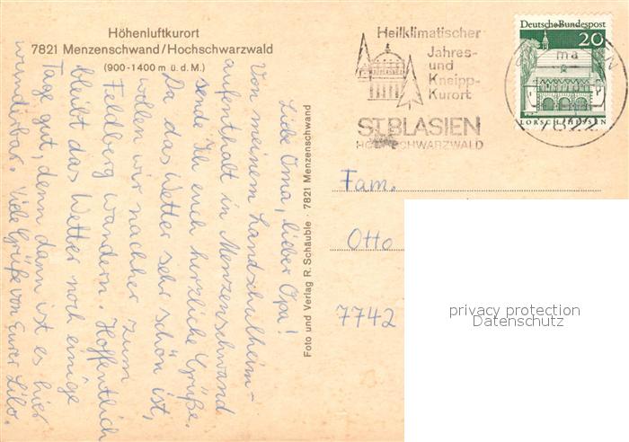 73537630 alte Postkarte Menzenschwand Panorama Hoehenluftkurort im Schwarzwald postalisch gelaufen Erhaltung siehe scans [FriedD77] KatCode: 11110008337097
