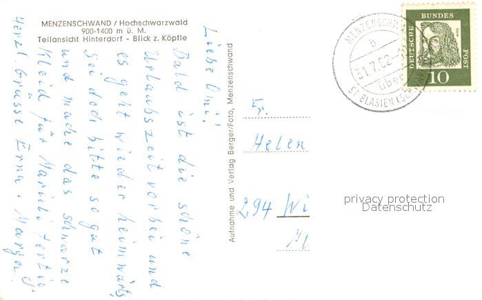 43252613 alte Postkarte Menzenschwand Teilansicht Hinterdorf Blick zum Koepfle Hochschwarzwald postalisch gelaufen Erhaltung siehe scans [FriedD77] KatCode: 11110008337097