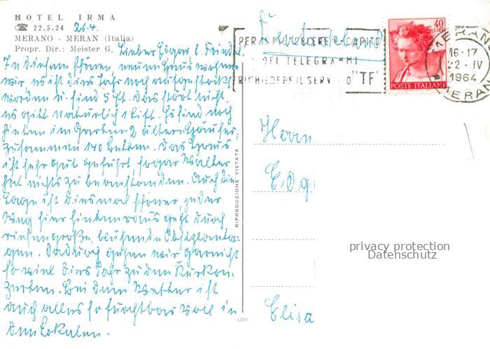 74155964 old postcard Meran MERANO IT Hotel Irma postalisch gelaufen Erhaltung siehe scans [WerneD78] KatCode: 11240