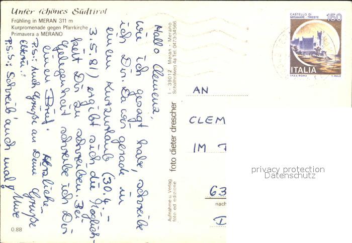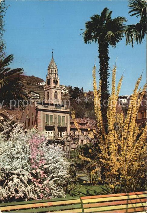 old postcard Meran Merano Kurpromenade mit Pfarrkirche postalisch gelaufen Erhaltung siehe scans