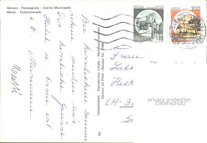 old postcard Meran Merano Kurpromenade Passeggiata Casino Municipale postalisch gelaufen Erhaltung siehe scans