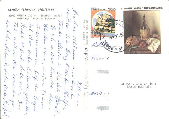 old postcard Meran Merano Stadtbild mit Texelgruppe Schloss Tirol Brunnenburg postalisch gelaufen Erhaltung siehe scans