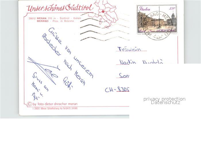old postcard Meran Merano Teilansichten Kurstadt Kirche Kurhaus Park Pferderennen Texelgruppe postalisch gelaufen Erhaltung siehe scans [FriedD77]