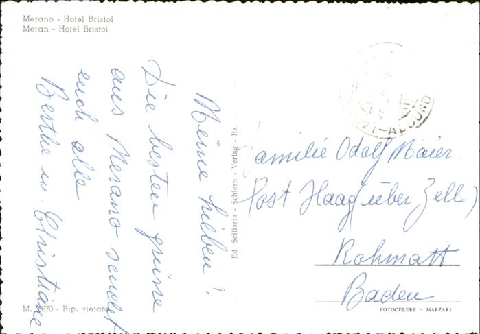 old postcard Merano Meran Hotel Bistol postalisch gelaufen
