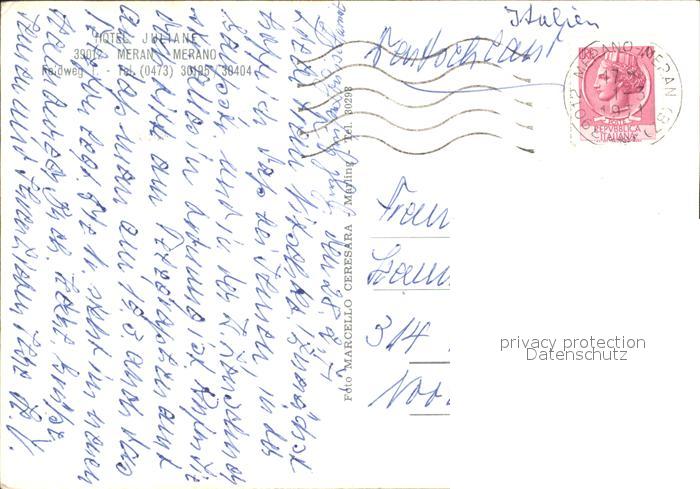 old postcard Merano Meran Hotel Juliane postalisch gelaufen Erhaltung siehe scans
