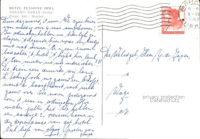 alte Postkarte Merano Meran Hotel Pension Irma postalisch gelaufen Erhaltung siehe scans