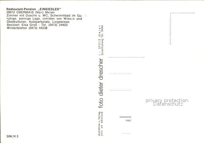 Merano Meran Obermais Restaurant Pension Einsiedler postalisch nicht gelaufen Erhaltung siehe scans