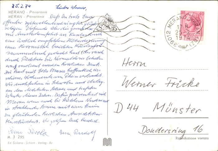 old postcard Merano Meran Panorama postalisch gelaufen Erhaltung siehe scans