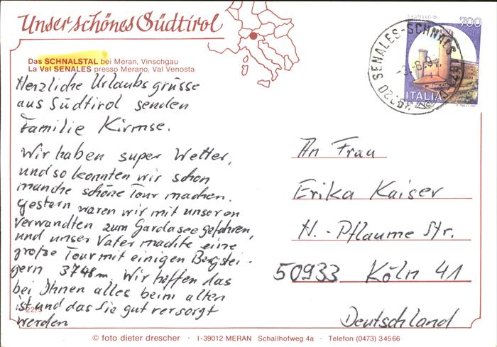 old postcard Merano Meran Schnalstal Val Senales Seilbahn postalisch gelaufen Erhaltung siehe scans