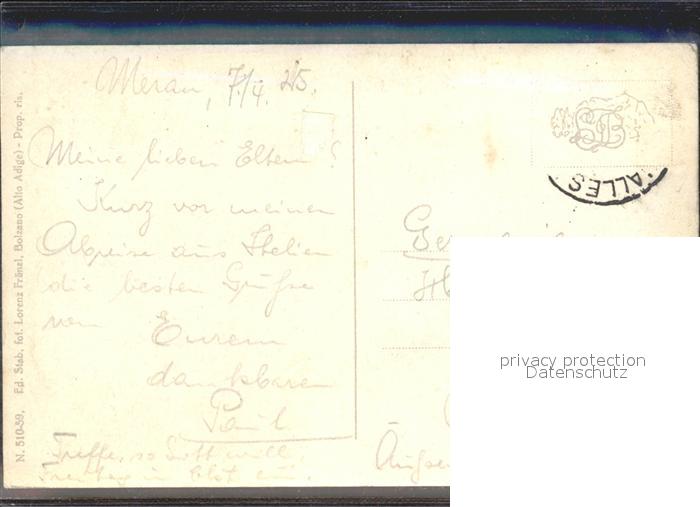 old postcard Merano Meran Stazione di curo Merano verso Val di Venosta postalisch gelaufen Erhaltung siehe scans