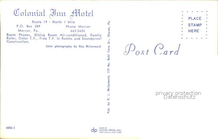 11688350 Mercer Pennsylvania Colonial Inn Motel postalisch nicht gelaufen KatCode: 14140410000000