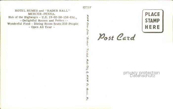 11688423 Mercer Pennsylvania Hotel Humes and Rader Hall postalisch nicht gelaufen Erhaltung siehe scans KatCode: 14140410000000