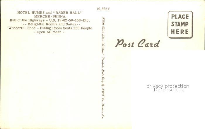 11688424 Mercer Pennsylvania Hotel Humes and Rader Hall postalisch nicht gelaufen Erhaltung siehe scans KatCode: 14140410000000