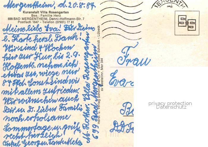 72694342 alte Postkarte Mergentheim Bad Kuranstalt Villa Rosengarten postalisch gelaufen Erhaltung siehe scans [KathaD79] KatCode: 11110008128007
