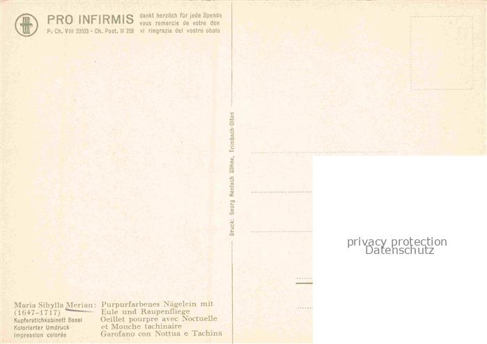 74092244 MERIAN Maria Sibylla Kuenstlerkarte Purpurfarbenes Naegelein Eule Raupenfliege Basel postalisch nicht gelaufen Erhaltung siehe scans [SanaeD93] KatCode: 22240000003200