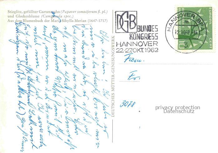 74152737 alte Postkarte MERIAN Maria Sibylla Kuenstlerkarte Stieglitz Gartenmohn Glockenblume postalisch gelaufen Erhaltung siehe scans [IrynaD87] KatCode: 22240000003200