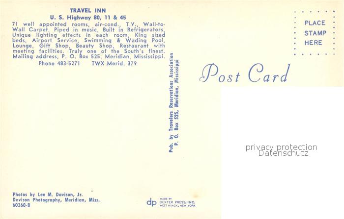 73277558 Meridian Mississippi Hotel Trave Inn Pool Restaurant postalisch nicht gelaufen Erhaltung siehe scans [LiesaD40] KatCode: 14140260000000