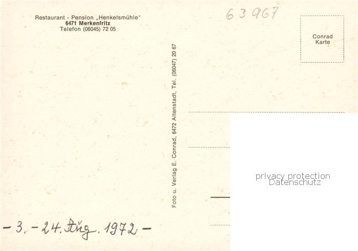 73864840 Merkenfritz Hirzenhain Restaurant Pension Henkelsmuehle postalisch nicht gelaufen Erhaltung siehe scans [FriedD77] KatCode: 11110006440011