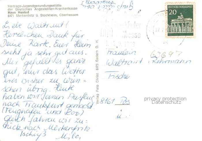 73854592 alte Postkarte Merkenfritz Hirzenhain Vertrags Jugendgesundungsstaette der DAK Haus Henkel postalisch gelaufen Erhaltung siehe scans [WerneD78] KatCode: 11110006440011