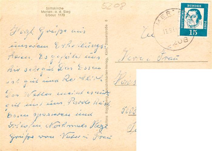 73888830 alte Postkarte Merten Sieg Eitorf Stiftskirche Friedhof postalisch gelaufen Erhaltung siehe scans [FriedD77] KatCode: 11110005382016
