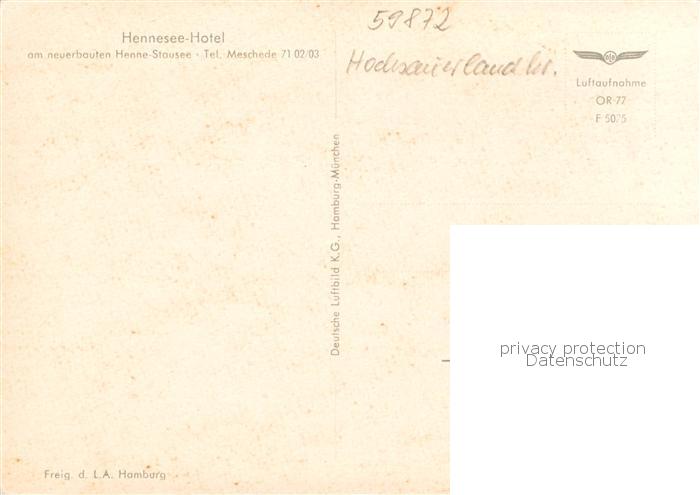 73838346 Meschede Hennesee Hotel am Hennesee Stausee Fliegeraufnahme postalisch nicht gelaufen Erhaltung siehe scans [WerneD78] KatCode: 11110005958004