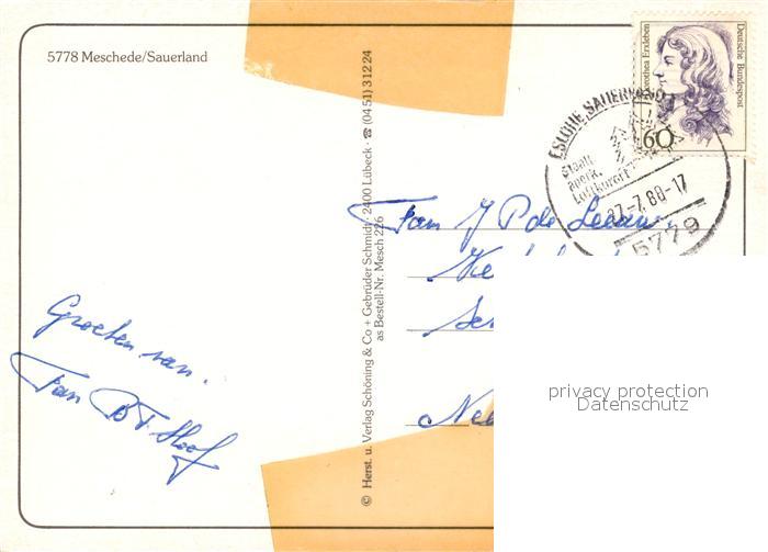 73213997 alte Postkarte Meschede Stadtplatz Kirche Friedenskirche Winzinger Platz Schloss Laer postalisch gelaufen Erhaltung siehe scans [WerneD78] KatCode: 11110005958004