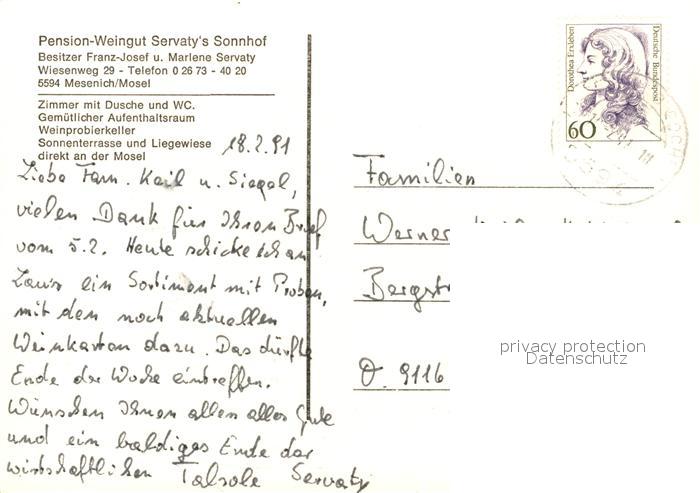 73542901 alte Postkarte Mesenich Cochem Pension Weingut Sevaty’s Sonnhof Landschaftspanorama Moseltal Weinberge postalisch gelaufen Erhaltung siehe scans [FriedD77] KatCode: 11110007135060