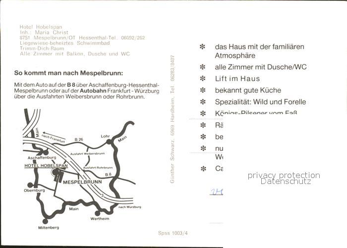 71965819 Mespelbrunn Hotel Hobelspan Gaststube Terrasse Ortsblick postalisch nicht gelaufen Werbekarte (keine Postkarte) Erhaltung siehe scans KatCode: 11110009671141
