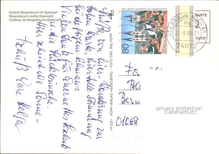 72354015 alte Postkarte Mespelbrunn Schloss Mespelbrunn im Spessart Schwanenteich postalisch gelaufen Erhaltung siehe scans KatCode: 11110009671141