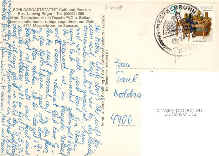 73739283 alte Postkarte Mespelbrunn Schlossgaststaette Cafe Pension postalisch gelaufen Erhaltung siehe scans [WerneD78] KatCode: 11110009671141