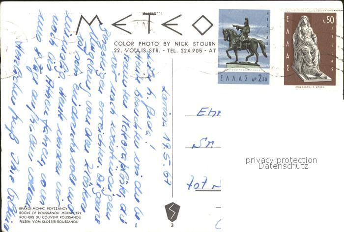 old postcard Meteora Felsen Kloster Roussanou postalisch gelaufen Erhaltung siehe scans