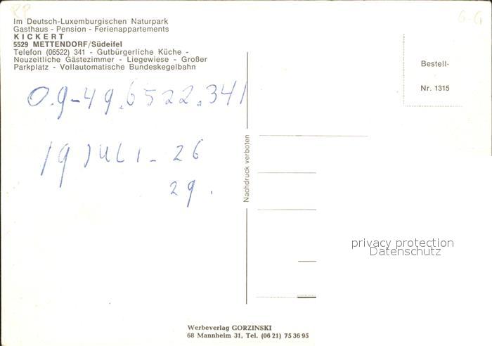 71928891 Mettendorf Eifel Kickert Gasthaus postalisch nicht gelaufen KatCode: 11110007232080