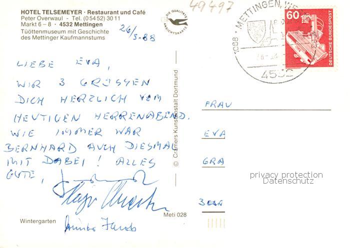 73863525 alte Postkarte Mettingen Westfalen Restaurant und Cafe postalisch gelaufen Erhaltung siehe scans [WerneD78] KatCode: 11110005566056