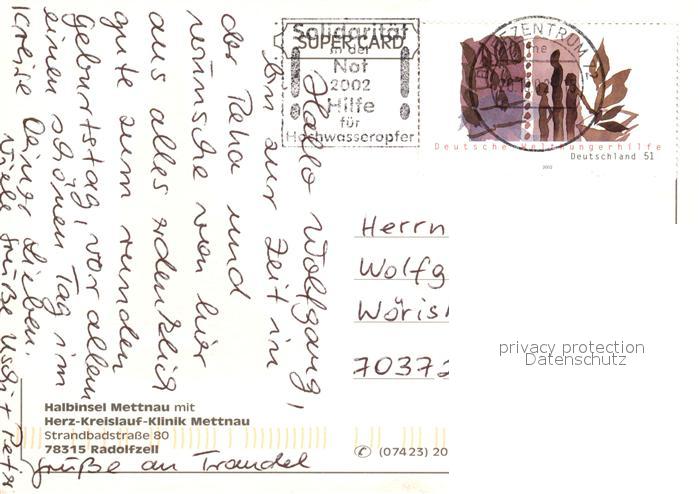 73080518 alte Postkarte Mettnau Radolfzell Bodensee Halbinsel Klinik Fliegeraufnahme postalisch gelaufen Erhaltung siehe scans [FriedD77] KatCode: 11110008335063