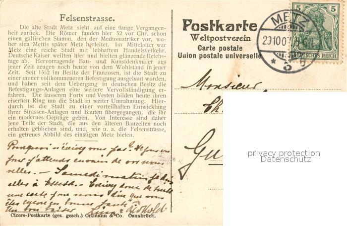 13484849 carte postale Metz 57 Moselle Felsenstrasse postalisch gelaufen Erhaltung siehe scans [WerneD78] KatCode: 11170057957463