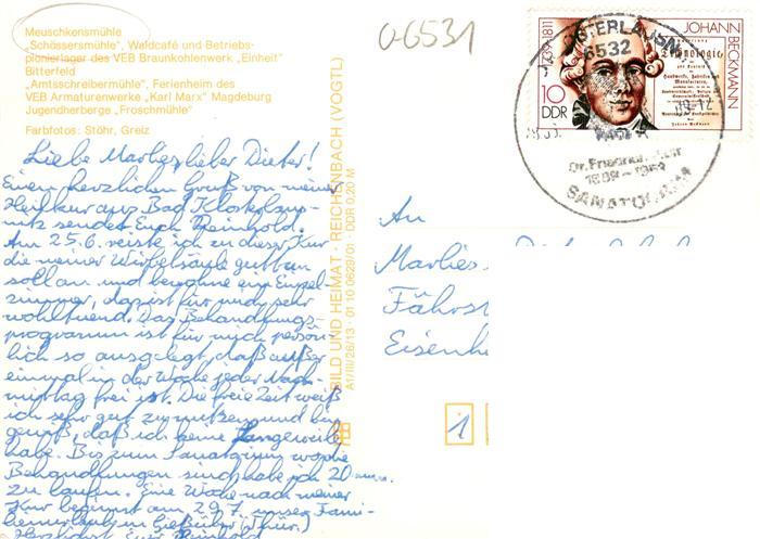 73943471 alte Postkarte Meuschkensmuehle Schloessermuehle Waldcafe und Betriebspionierlager des VEB Bitterfeld Amtsschreibermuehle Ferienheim des VEB Karl Marx Jugenherberge Froschmuehle postalisch gelaufen Erhaltung siehe scans [WerneD78] KatCode: 11110016074041
