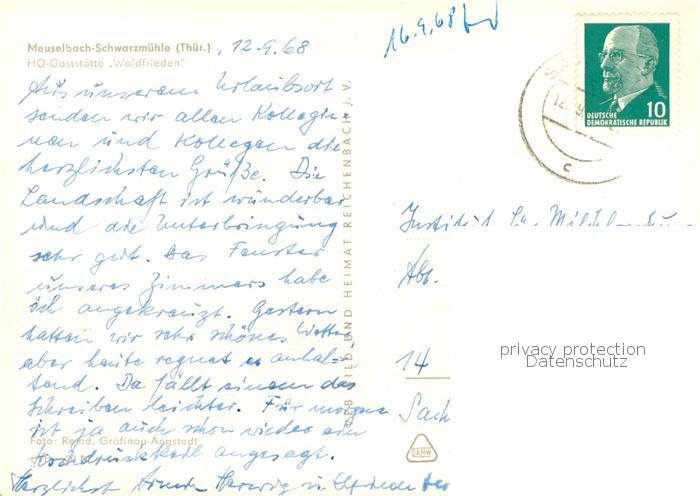 73765032 alte Postkarte Meuselbach-Schwarzmuehle HO Gaststaette Waldfrieden postalisch gelaufen Erhaltung siehe scans [WerneD78] KatCode: 11110016073056